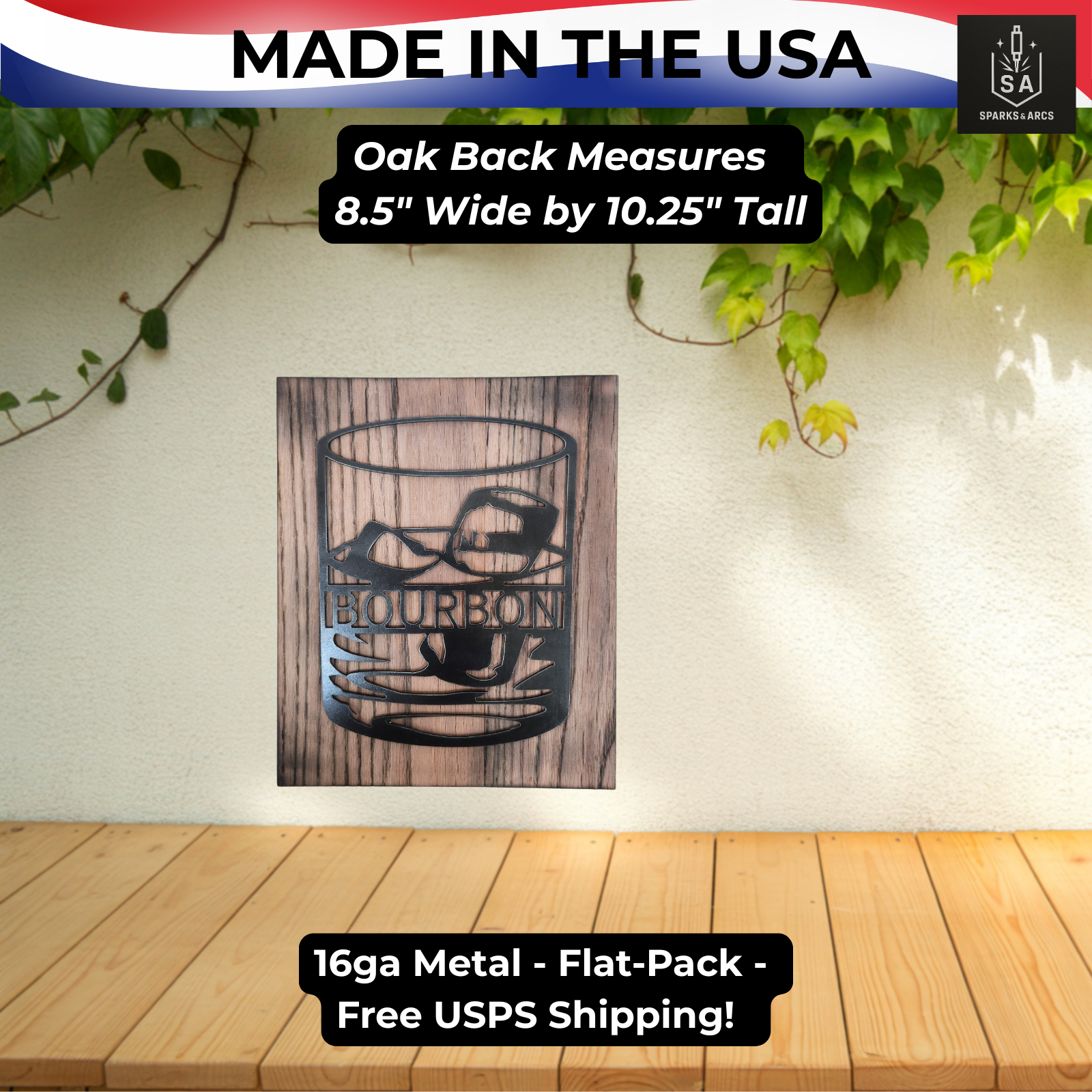 Raise a glass to great taste with this handcrafted Whiskey & Bourbon Glass Metal Sign. Precision-cut from durable 16-gauge steel, this sign captures the classic look of a drink on the rocks. It’s the perfect addition to a man cave, home bar, or office. Choose the standalone sign or upgrade to a premium option with a rustic burnt oak backing or a classic wood frame for a complete, ready-to-hang piece of art.